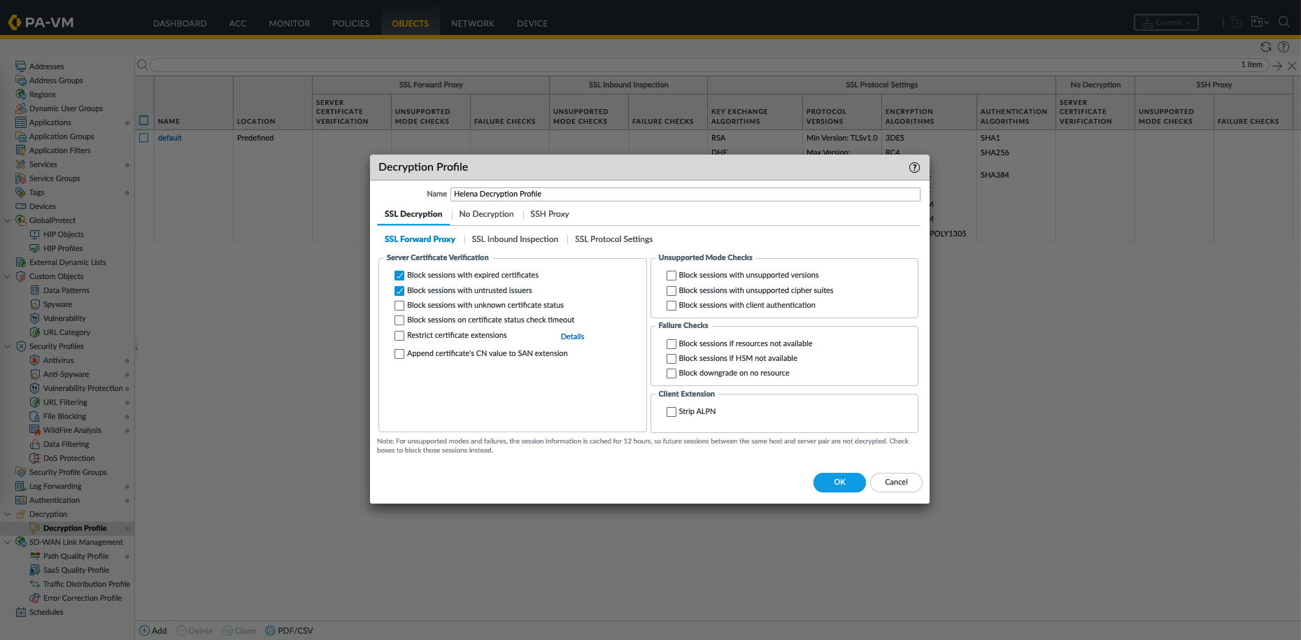 First create a Decryption Profile, on Objects » Decryption Profile, create new