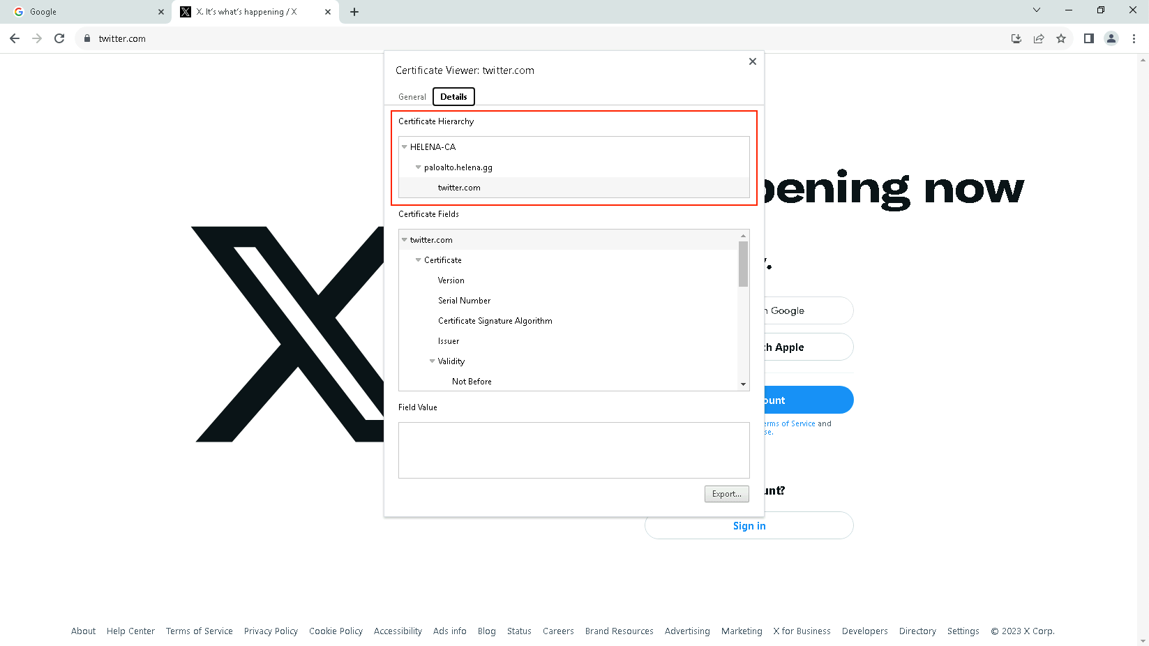 Looking at certificate hierarchy, we can see the PKI Heirarchy, where paloalto.helena.gg acts as a Sub-CA of HELENA-CA, issuing certificate for twitter.com