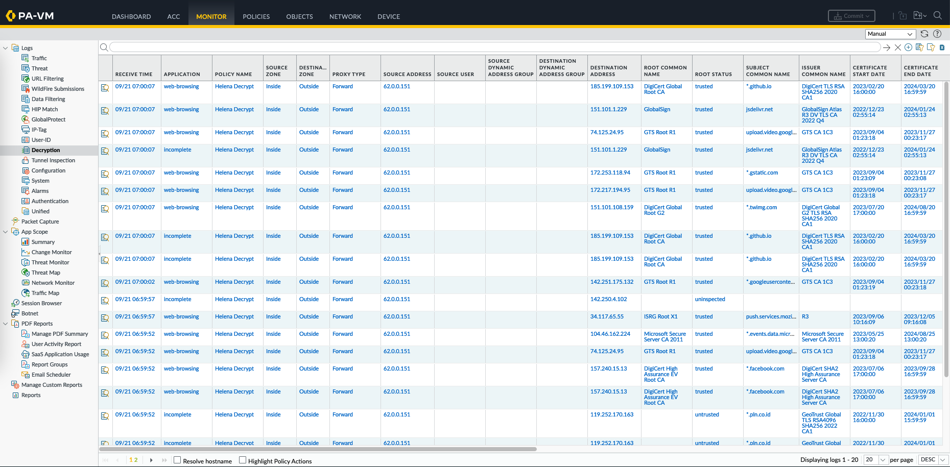 Now if we access anything on the internet, we’ll see the certificate issuer being the paloalto, meaning paloalto decrypts, inspects, and re-encrypts the traffic before it being forwarded to the actual destination