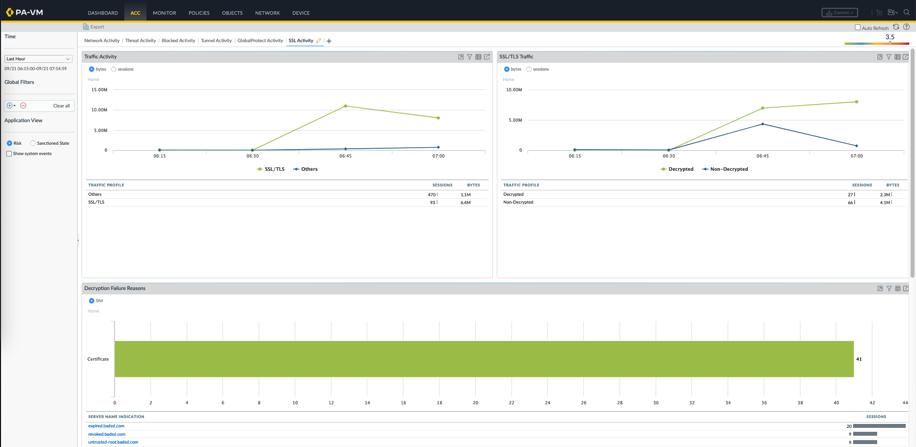 On ACC » SSL Activity, we can see the overall SSL Decryption stats, as well as the sites that are not allowed to be accessed because of bad certificates
