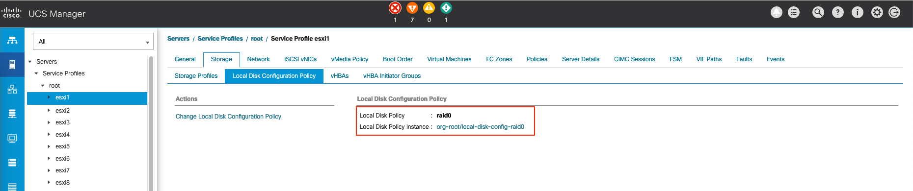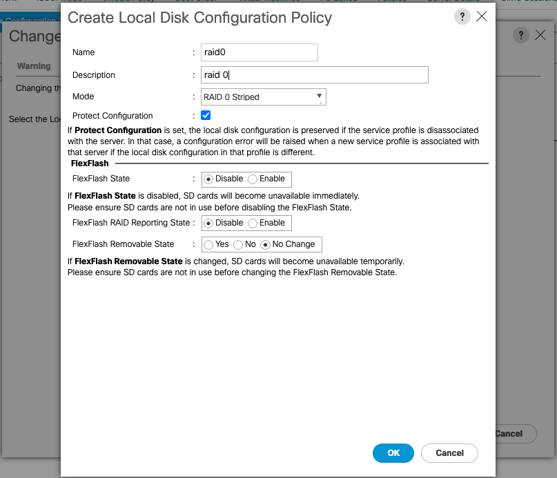 Select Create Local Disk Configuration Policy, give it a name and change the mode to RAID 0 Striped