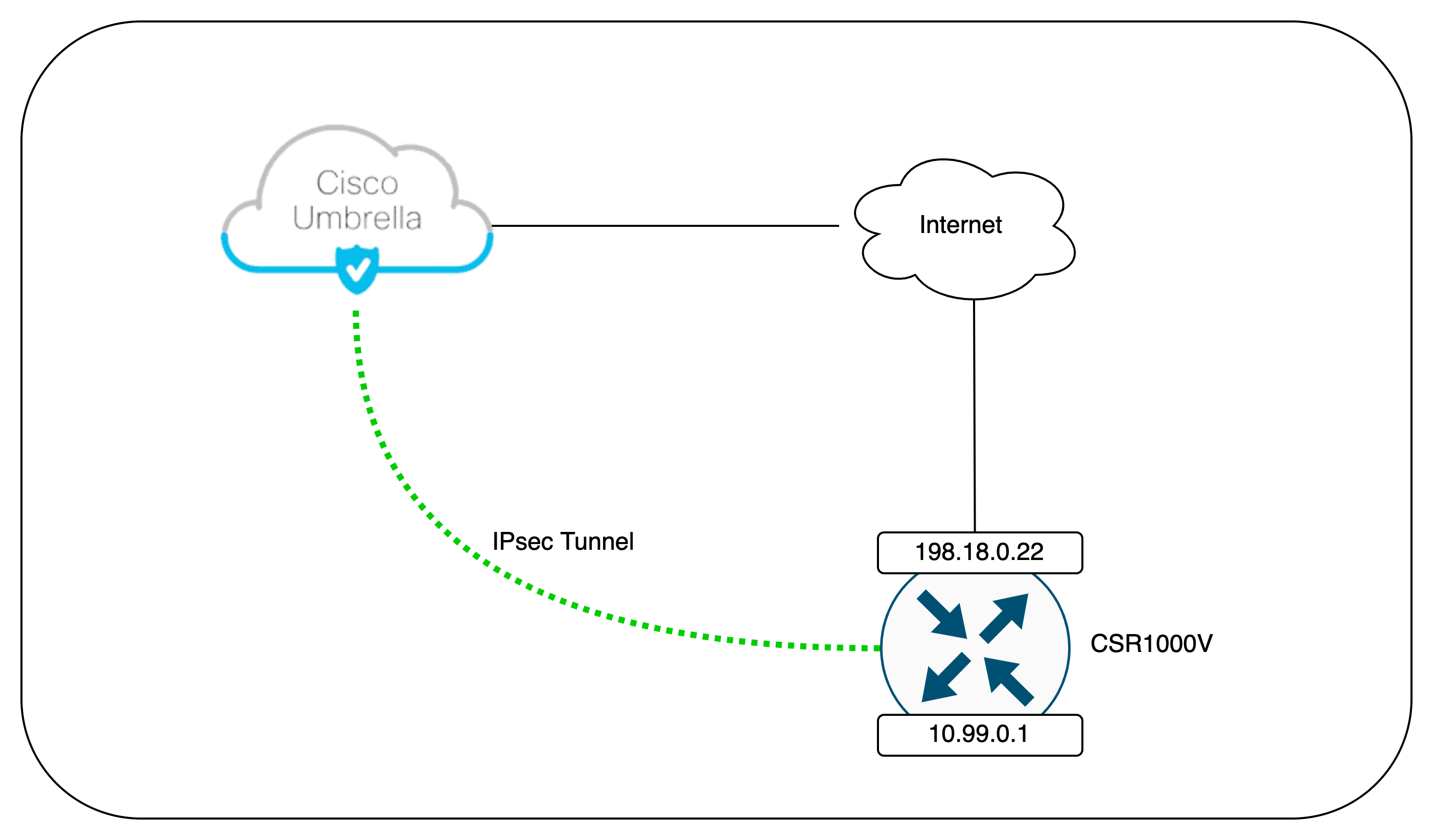 On this deployment, we will establish a IPsec Tunnel connection from the CSR1000V Router to the Umbrella Cloud, making all the internet traffic coming form the Inside Segment will be routed to the Umbrella first before heading to the Internet