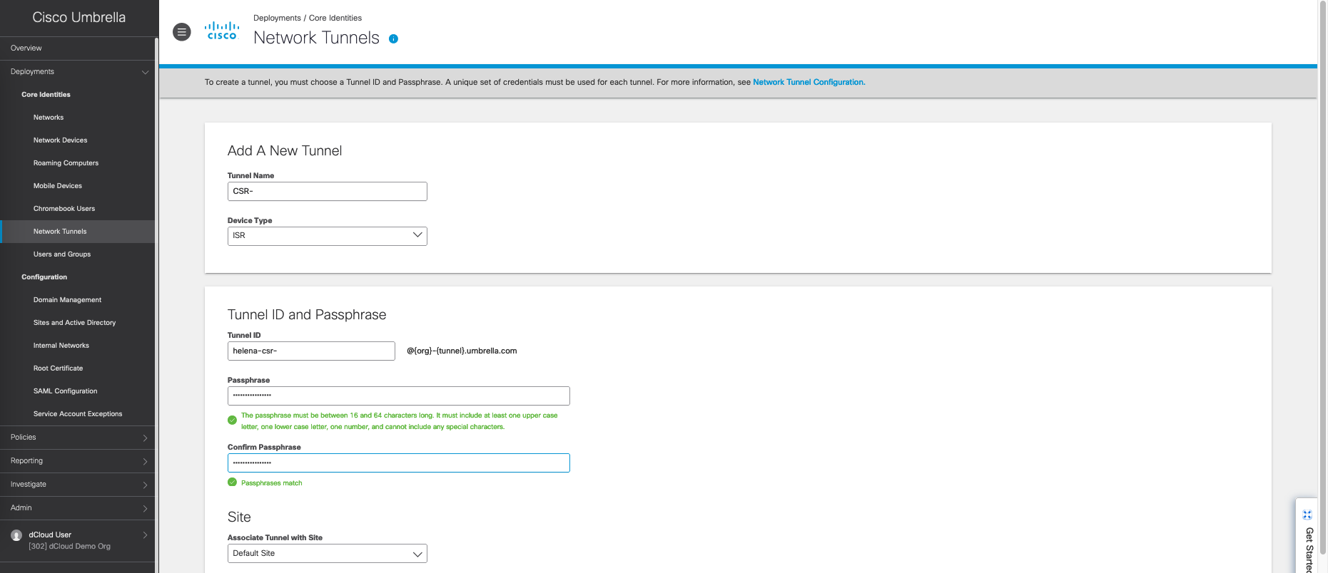 On Cisco Umbrella, go to Deployments » Network Tunnels, add new for our CSR router
