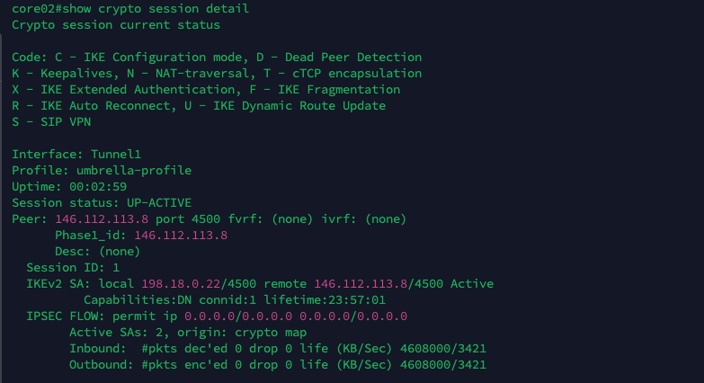 After that define an IPSec profile named “umbrella” to use the “umbrella-ts” transform set for encryption and the “umbrella-profile” IKEv2 profile for the VPN negotiation