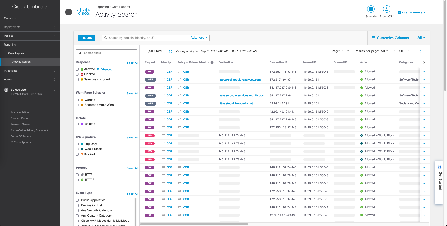 Here we can see the reports of all traffic coming in from the inside segment of 10.99.0.0/24 being inspected by Cisco Umbrella before being forwarded to the actual destination