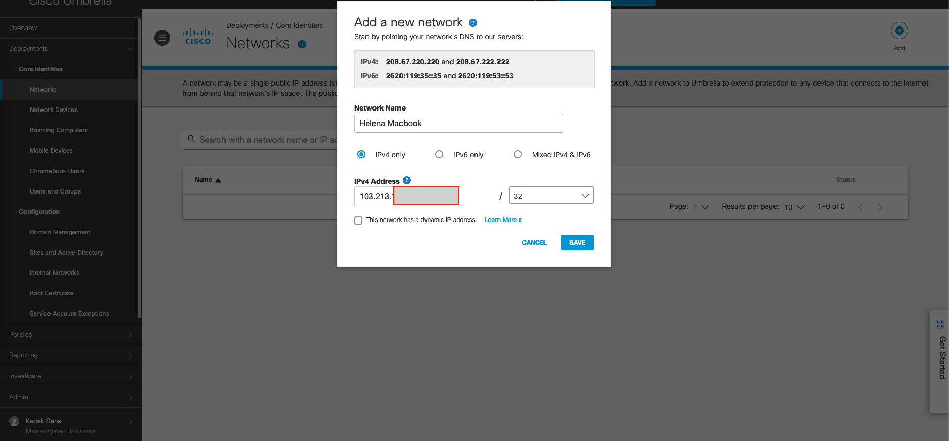 Basically there’s 2 ways to use Cisco Umbrella, the first one being the DHCP and DNS Server option where all the endpoint just set the Umbrella’s Public OpenDNS IP as the DNS Server. This deployment requires our Public IP Address to be registered on the Umbrella’s Dashboard to work and it doesn’t show the internal IP Address of each request made from the client.