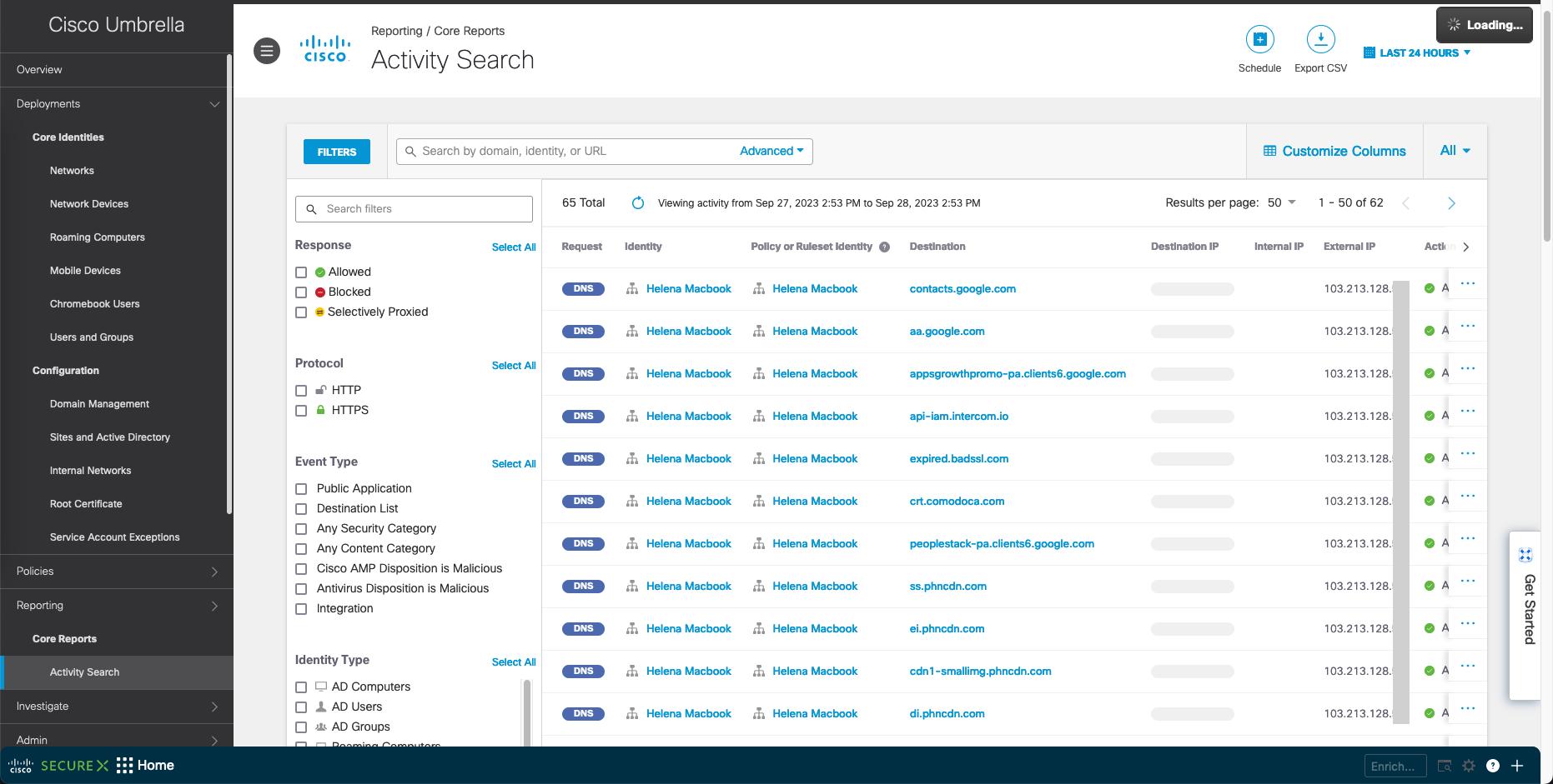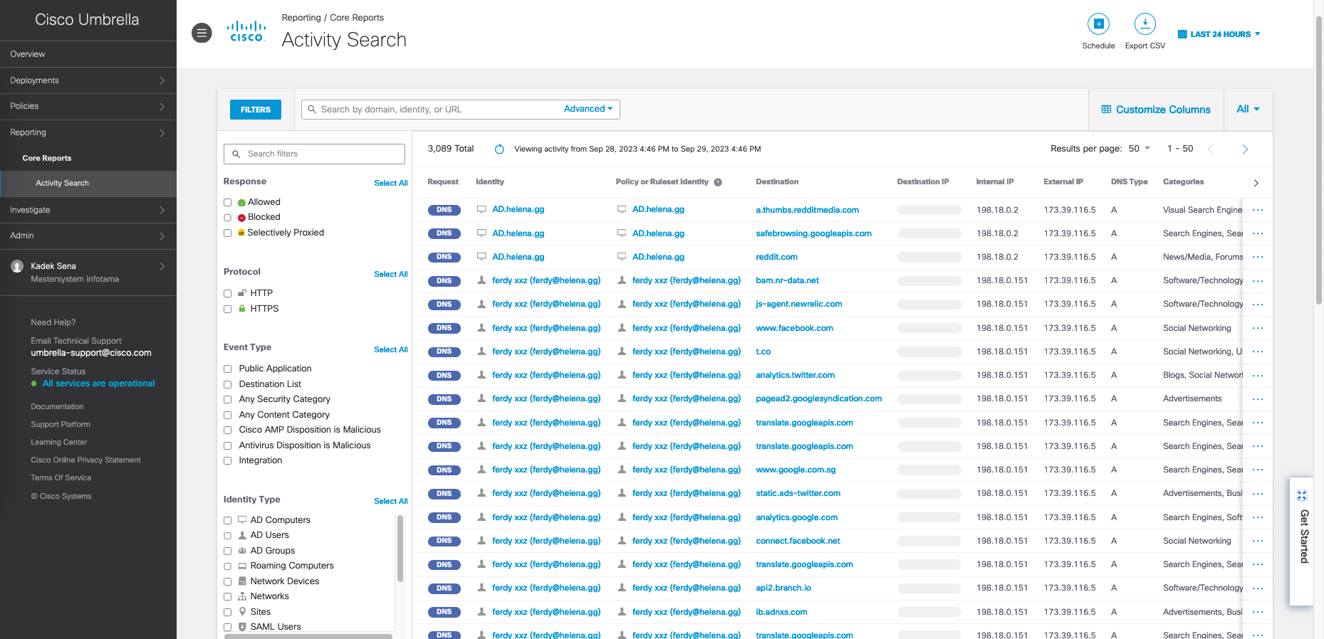 And after that all the DNS Queries made will be answered by Umbrella and also recorded. As seen here even the Internal IP Address is shown on the report