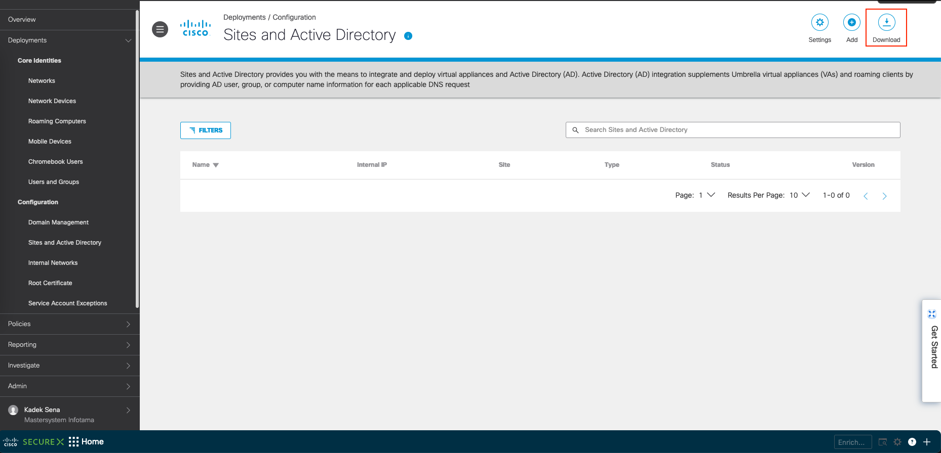With this type, we need to deploy the minimum of two virtual appliances for redundancy. On Deployments » Sites and Active Directory, select Download