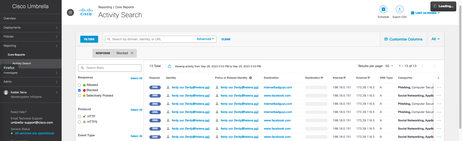 And on Activity Search, we can see all the blocked traffic accessed by the client, showing the unsafe websites along with the blocked sites set by the policy, which in this case is facebook