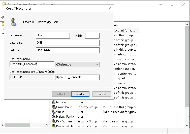 On the Domain Controller, create a new user with Domain Admin Privilege named OpenDNS_Connector