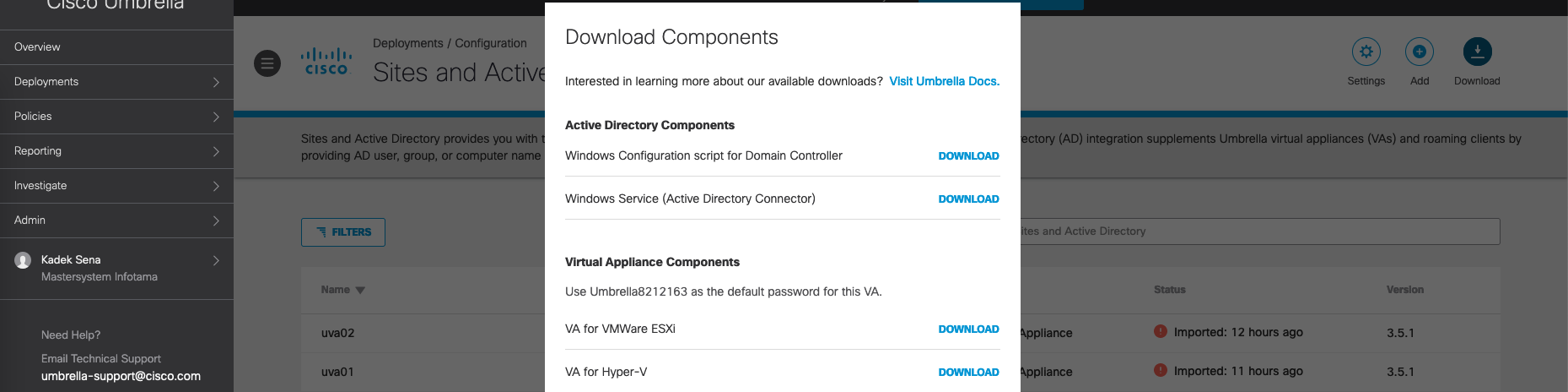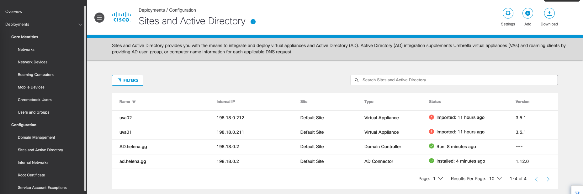 Now both VAs should show up on Umbrella on Sites and Active Directory